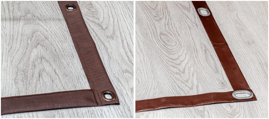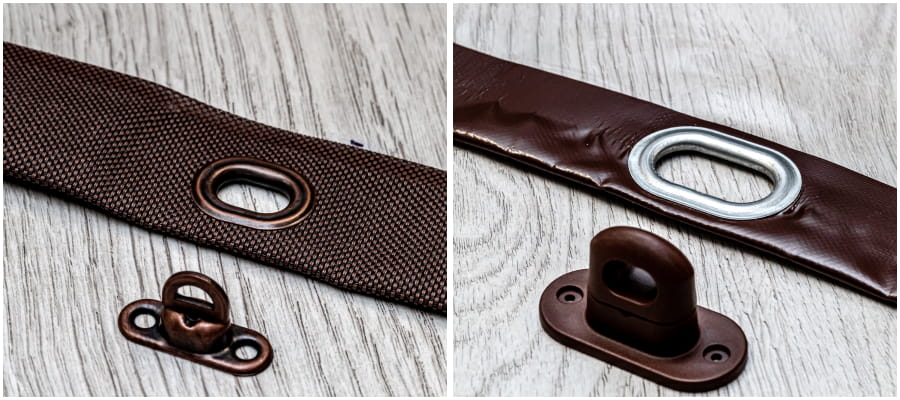 По размеру элементы крупноваты: люверсы — примерно 40х60 мм, кант 50 мм. в ширину. Это ни на что не влияет, кроме как на внешний вид — смотрится не очень изящно.