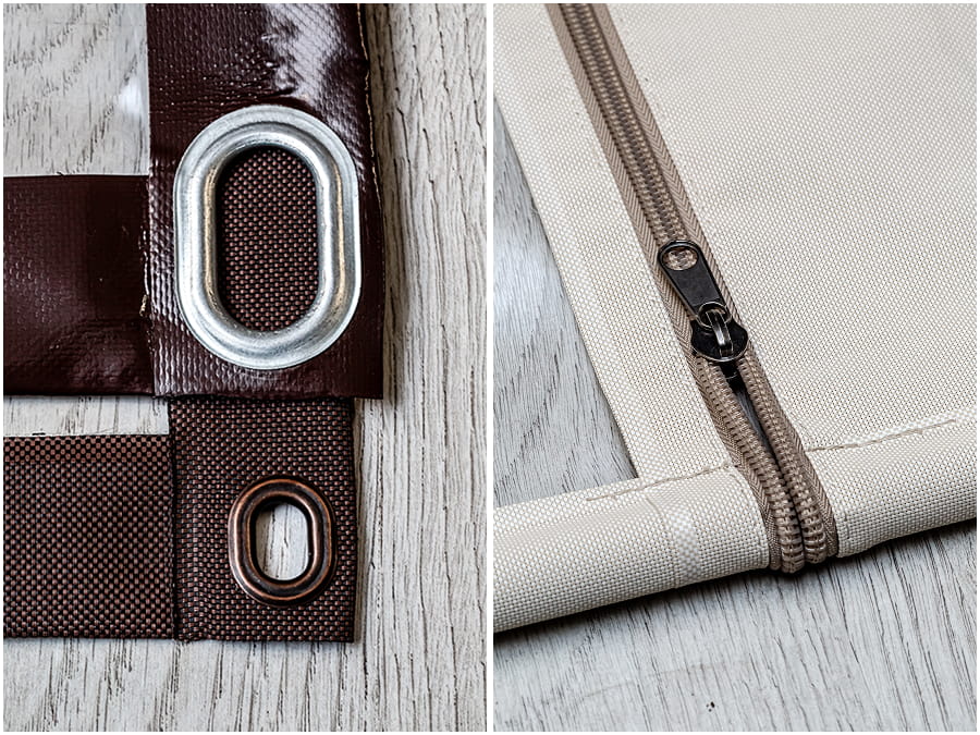 | Фурнитура | Люверсы из бюджетного металла, который со временем ржавеет. Размер люверса 60х40 мм. Цвет серебристый стандартный. Пластиковый замок. Ориентир: низкая цена. | Люверсы и замок из нержавеющего металла. Размер люверса 17х11 мм. 6 вариантов цвета. Ориентир: выносливость, долговечность — крепежи должны выдержать экстремальные перепады температур, воздействие солнца, ветра, дождя, снега. |