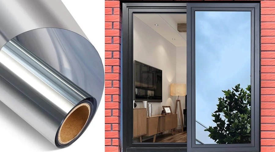 Практичное и недорогое решение. Пленка наклеивается непосредственно на стекло и отражает значительную часть солнечных лучей и тепла.