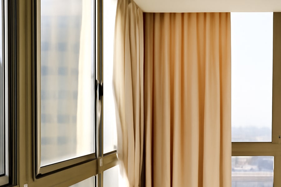 - Учитывайте тип открывания окон. Для распашных конструкций подходят почти любые модели. А вот выбор штор для раздвижных окон на балконе требует особого подхода: полотна не должны мешать створкам двигаться.