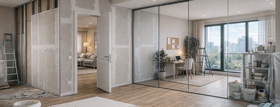 В отличие от кирпичных или бетонных перегородок, гипсокартон не требует усиления основания. Его можно устанавливать даже в помещениях со старыми перекрытиями. При этом каркасная система позволяет равномерно распределять нагрузку. Некоторые альтернативные решения, например стеклянные раздвижные перегородки, могут быть тяжелее.