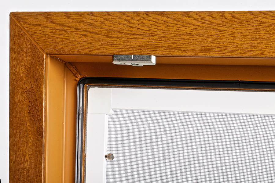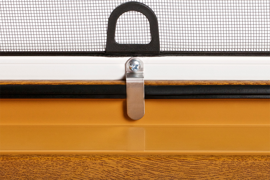 - Аккуратно вставьте антимоскитку в пазы держателей, начиная с верхней части, приподнимите её до упора, затем прижмите нижнюю часть к раме, зафиксируйте в нижних Z-кронтштейнах.