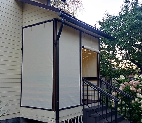 Шторы установлены со стороны интерьера веранды. Снаружи конструкция выглядит максимально аккуратно — без видимых ремней. Изнутри пользоваться удобно: подъём/фиксация полотен занимают секунды. Точный подгон по проёмам улучшает прилегание по периметру.